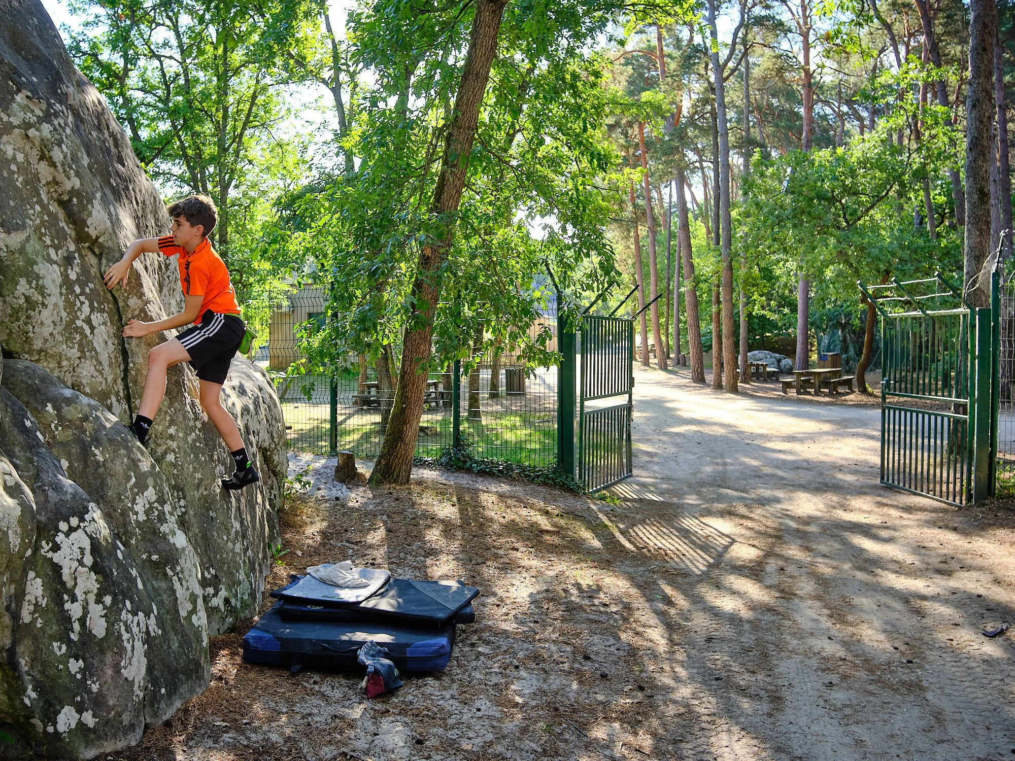 The Buthiers areas have never really lit my fire before. Back in the pre-kids days of big trips with a group of mates, Buthiers always tended to feel like a long way out of the way, with a lot of big intimidating lines. I don’t mind doing the odd highball but we tend to spend a lot of time doing that on grit, so I don’t always necessarily want to be getting gripped on holiday too - a change is nice! Buthiers is also lacking a lot of the nice forest ambience what with the crags being awkwardly located right next to a leisure centre and carpark. However, as I discovered on an early morning visit with MiniDave#2 this trip, there’s actually a really nice and fairly chill set of circuit problems at the west-most end of Buthiers Piscine, and although some of it is literally right by the fence of the swimming complex it’s a nice spot, with a decent bit of shade and some real quality climbing on the oranges and blues, with a separate yellow circuit (which is more like a sort of older kids circuit - probably ideal for 8-10yr olds).